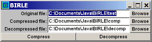 BIRLEBIRLE is a bijective Run Length Encoding (RLE) compressor implemented in Java.Like BIAC, it is another port of a compressor which was written by Mark Nelson and modified to make bijective by David Scott. I've modified it in such a way that it is no longer compatible with the original. I felt it was not conservative enough - and had too-great a tendency to cause expansion on perfectly normal files. As a consequence I changed it to consider a run as anything starting wiuth three repeated characters (rather than the original two). This modification increased the total compression ratio on the corpus from 11.49% to 12.72%. Increasing the run threshold further appeared to have deleterious results overall. This code is intended to act as a pre-processor for other compression schemes. It leaves the overall format of most files more-or-less intact (and just eliminates runs) leaving the floor open for subsequent compressors of different types. The improvement that can be expected is relatively small on normal files - but is increased if the files in question can be expected to contain many runs. For example, BIAC reduces the files in the corpus from 3,312,291 bytes to 1,841,675 bytes - a reduction of some 44.39%. If BIRLE is applied first, the reduction is to 1,821,284 bytes, making an overall compression ratio of 45.01%. The saving is of 20,391 bytes - or 0.62% of the total. There is a GUI front end as well as a command-line interface. Here's a snapshot of it in action: